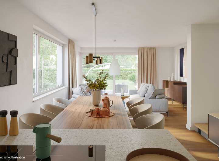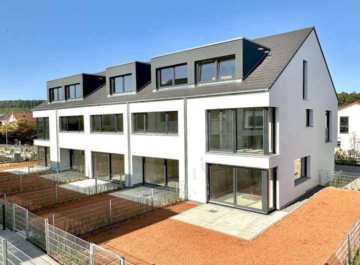Weil die Häuser inmitten von schönen Gärten stehen, fällt der Blick stets ins Grüne. Aus dem Erdgeschoss tritt man auf seine Terrasse mit Garten. Alle Terrassen schauen nach Südwesten und kommen so in den Genuss besonders vieler Sonnenstunden. Bei einem gemütlichen Frühstück auf der Terrasse kann der Blick über den Garten schweifen oder grillen Sie mit Freunden, während die Kinder im Garten spielen.