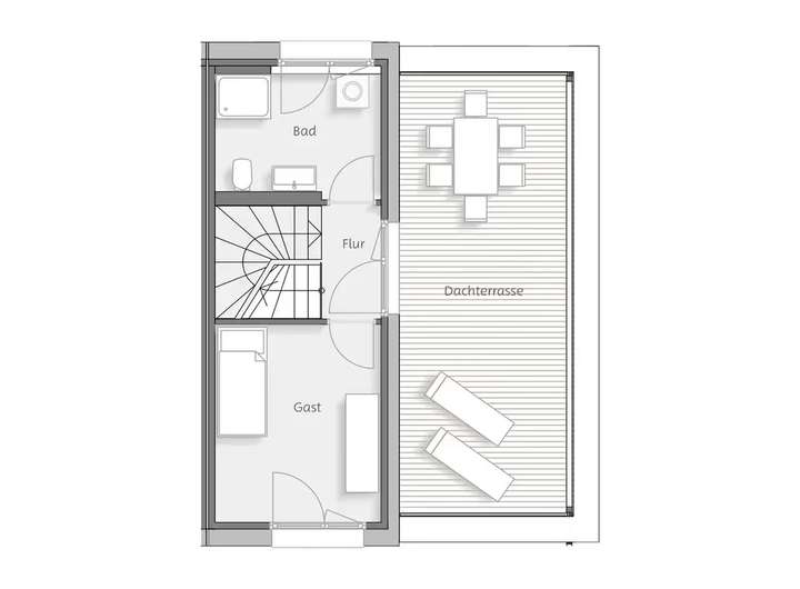 Ob zu zweit oder als Familie, in den beiden oberen Etagen findet jeder seinen persönlichen Rückzugsraum und nette Gäste können hier beherbergt werden. Die Dachterrasse mit wetterbeständigen Bodendielen ist im Sommer ein gerne genutztes zusätzliches Freiluft-Wohnzimmer.