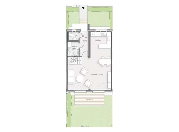 Das Erdgeschoss ist großzügig und offen konzipiert. Kochen, Essen und Wohnen bilden den Tagesmittelpunkt der Familie. Der Garten wird durch die Fenstertüren zur Terrasse in den Wohnbereich integriert.