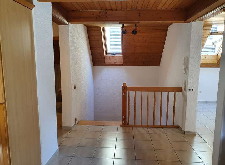 Über ein paar Treppenstufen kommen sie in den zweiten Stock. Dort befinden sich 3 Schlafzimmer und eine große Diele und ein kleineres Zimmer mit dem Treppenaufgang in den Dachboden.