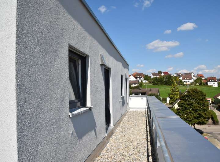 - traumhaften 30 m² Dachterrasse auf der Südseite mit überdachtem Sitzbereich und Schlossblick.