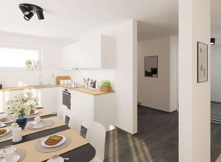 Willkommen in Ihrem neuen Einfamilienhaus. Im Erdgeschoss finden Sie eine geräumige Küche, die zum gemeinsamen Kochen und Speisen einlädt. Das helle Wohnzimmer wird zum Familientreffpunkt und eignet sich ideal für entspannte Abende. Die anliegende Terrasse ist der perfekte Ort für sommerliche Grillabende. Ein Arbeitszimmer bietet Platz für pure Konzentration. Ein Badezimmer steht für Ihre Gäste bereit.
