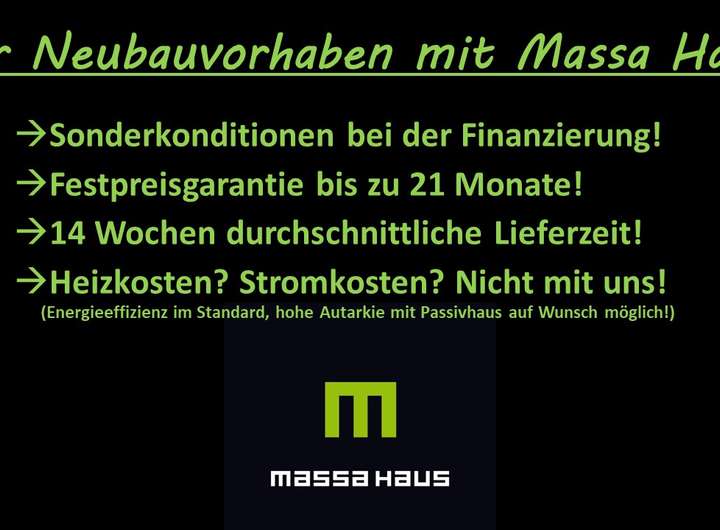 Gegenüber einem Sanierungsobjekt zahlst Du mit einem Neubau i.d.R. eine deutlich geringere Rate bei gleichem Invest, dabei darfst Du Dir aufgrund der höheren Energieeffizienz eigentlich sogar deutlich mehr Rate leisten. Dieser Effekt wird mit Massa Haus noch sehr viel deutlicher Dank Sonderkonditionen mit Zinsnachlässen bei der Baufinanzierung. Hinzu kommen geringere Grunderwerbnebenkosten, höhere Beleihungswerte (verbessern ebenfalls die Konditionen) und eine höhere Kostensicherheit inkl. Festpreisgarantie auf das Massa Haus. Mit der Massa- Haus Baufinanzierung werden KfW- Programme wie z.B. das Wohneigentumsprogramm wie Eigenkapital gewertet wenn die Beleihung grundsätzlich passt.