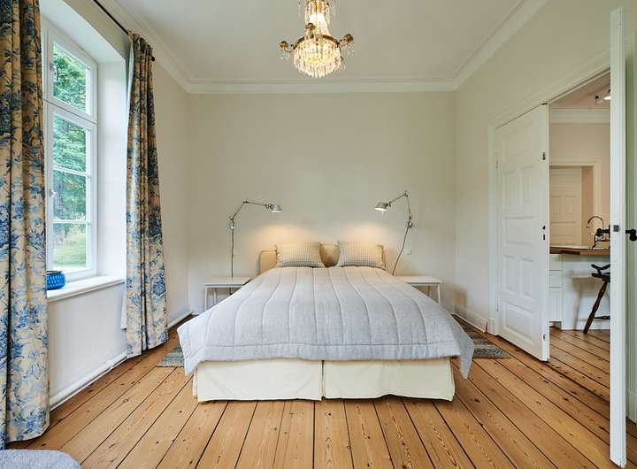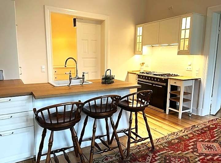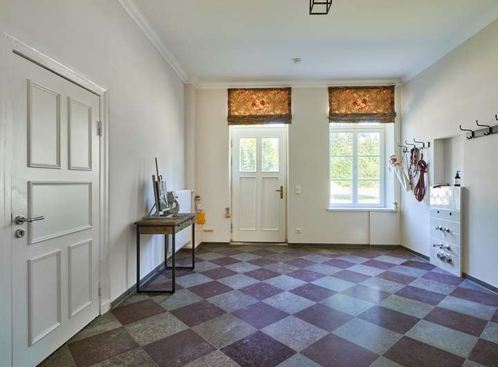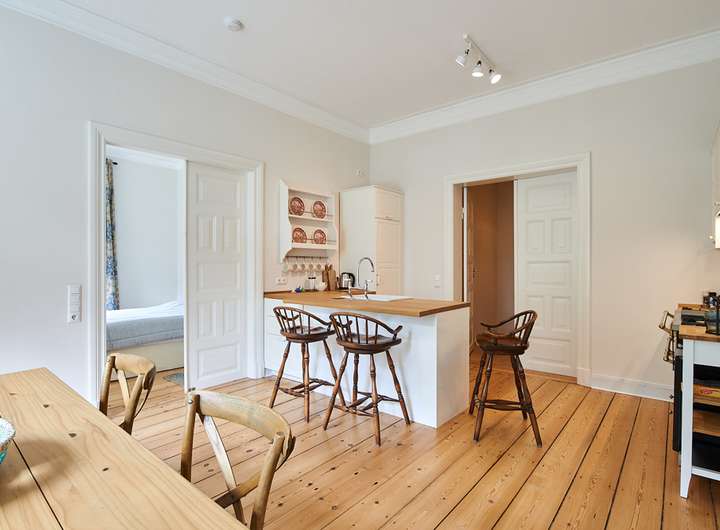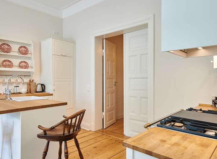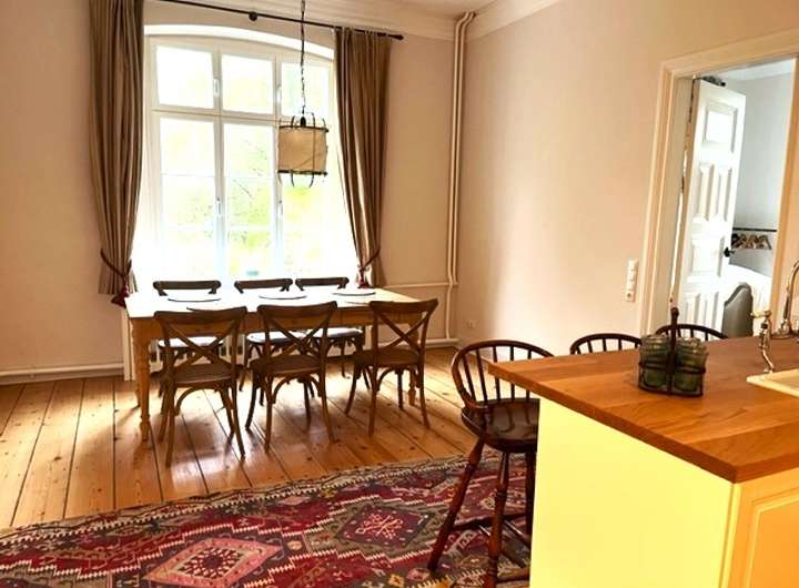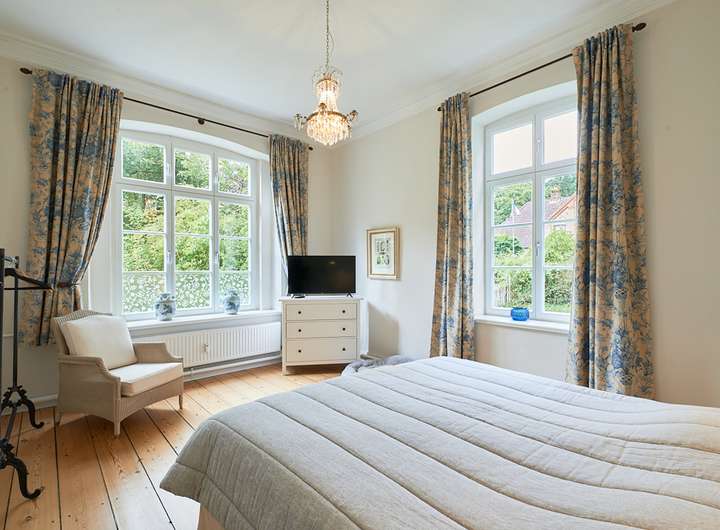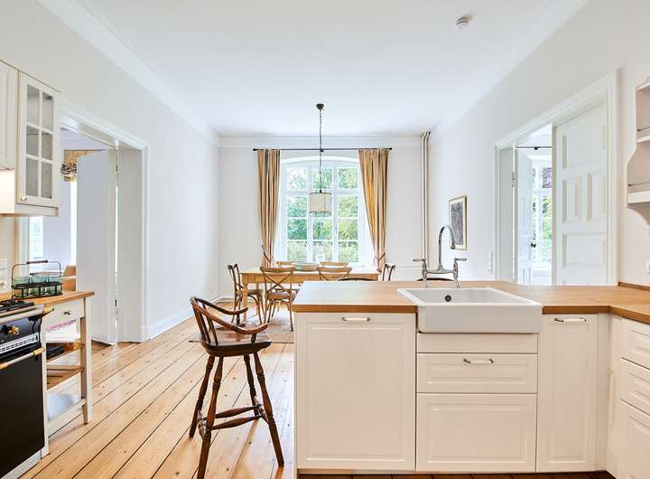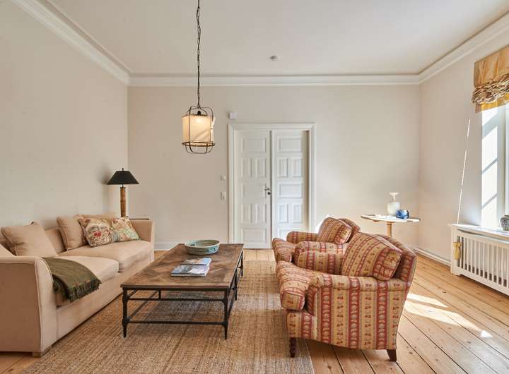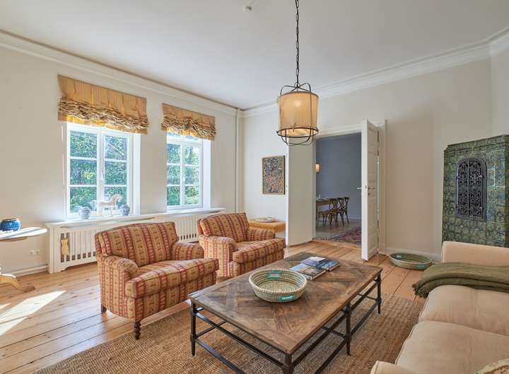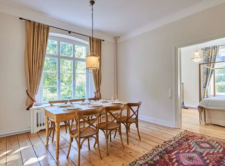Die hier beschriebene Wohnung Schlobitten verfügt über wirklich herrschaftliche Räumlichkeiten. Die hohen Fensterelemente lassen zu jeder Tageszeit enorm viel Licht eintreten. Der noch aus dem gegenüberliegenden Schloss Rantzau stammende Kachelofen garantiert auch an norddeutschen Herbsttagen behagliche Wärme.
