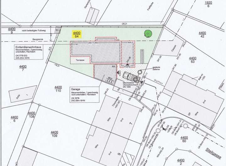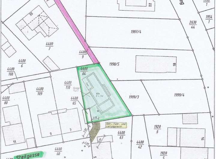 Anmerkung: Ein städtischer Weg (im Lageplan rot gekennzeichnet) verbindet das Grundstück mit der Wellbornstraße und kann auf Wunsch ebenfalls erworben werden.