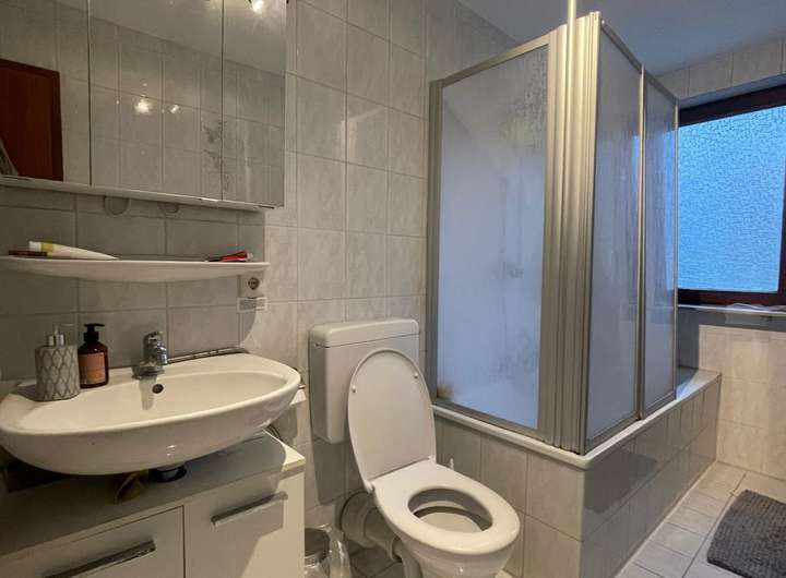 Laminatboden, Hochwertige Einbauküche von 2014 (incl. Elektro-Verkabelung), Siemens Geschirrspüler 2017, Falt-Duschwand, Spiegel- und Waschbecken-Unterschrank, SAT-Schüssel montiert (s. a. Anlage).