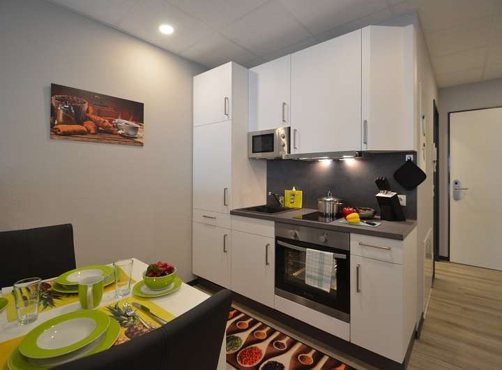 - Single-Einbauküche mit Herd, Backofen, Kühlschrank, Mikrowelle, Wasserkocher inkl. Ausstattung