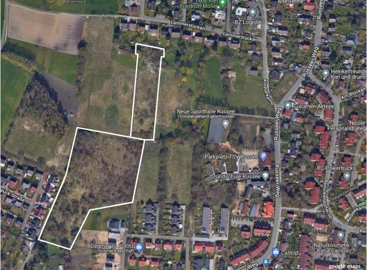 Verkauft werden soll ein landwirtschaftliches Grundstück und Grünfläche in Kiel-Russee. Das Grundstück besteht aus drei Flurstücken und ist 23.258 m² groß. Nutzbar ist das Grundstück als Acker- und Grünland. Die beiden mit Bäumen und Sträuchern bewachsenen Flurstücke befinden sich im Geltungsbereich eines Bebauungsplanes. Vor diese beiden Flurstücke ist laut B-Plan eine landwirtschaftliche Nutzung vorgesehen.