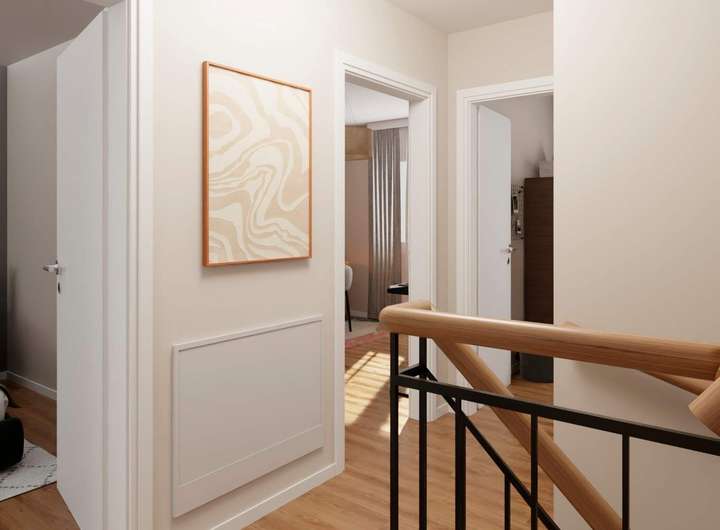 In diesem Haus erleben Sie wahre Wohlfühlmomente. Der Eingangsbereich führt Sie direkt in die separate Küche, die viel Raum für kulinarische Kreationen bietet. Praktisch ist auch das Gäste-WC auf dieser Ebene. Von der Küche gelangen Sie direkt in den Wohnbereich, ideal für gemütliche Abende mit Familie und Freunden. Große, bodentiefe Fenster lassen viel Licht herein und bieten einen Blick auf Ihre private Terrasse und den Garten. Das stilvolle Badezimmer mit Badewanne sorgt für Komfort und Entspannung. Im Obergeschoss befinden sich drei weitere Zimmer, die flexibel als Schlafzimmer, Büro oder Kinderzimmer genutzt werden können. Noch mehr Raum bietet das Dachgeschoss. Ein Haus, das mit Ihren Plänen wächst? Das unausgebaute Dachgeschoss bietet Ihnen genau diese Freiheit. Ob zusätzlicher Rückzugsort, Hobbyraum oder Platz für Gäste – hier gestalten Sie selbst, was Ihnen wichtig ist.