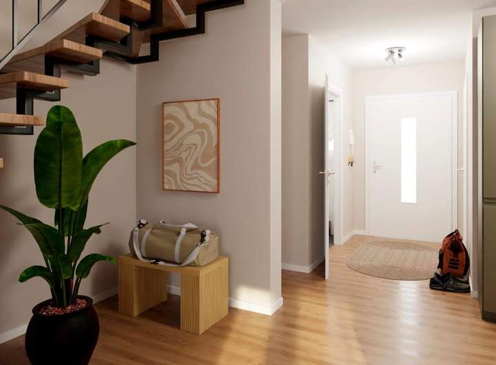 Herzlich willkommen in Ihrer neuen Doppelhaushälfte. Das Erdgeschoss empfängt Sie mit einem offenen Wohn- und Essbereich, ideal für gemütliche Abende mit Familie und Freunden. Große, bodentiefe Fenster lassen viel Licht herein und bieten einen Blick auf Ihre private Terrasse und den Garten. Praktisch ist auch das Gäste-WC auf dieser Ebene. Das stilvolle Badezimmer mit Badewanne sorgt für Komfort und Entspannung. Im Obergeschoss befinden sich drei weitere Zimmer, die flexibel als Schlafzimmer, Büro oder Kinderzimmer genutzt werden können. Noch mehr Raum bietet das Dachgeschoss. Ein Haus, das mit Ihren Plänen wächst? Das unausgebaute Dachgeschoss bietet Ihnen genau diese Freiheit. Ob zusätzlicher Rückzugsort, Hobbyraum oder Platz für Gäste – hier gestalten Sie selbst, was Ihnen wichtig ist.