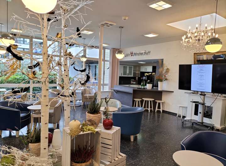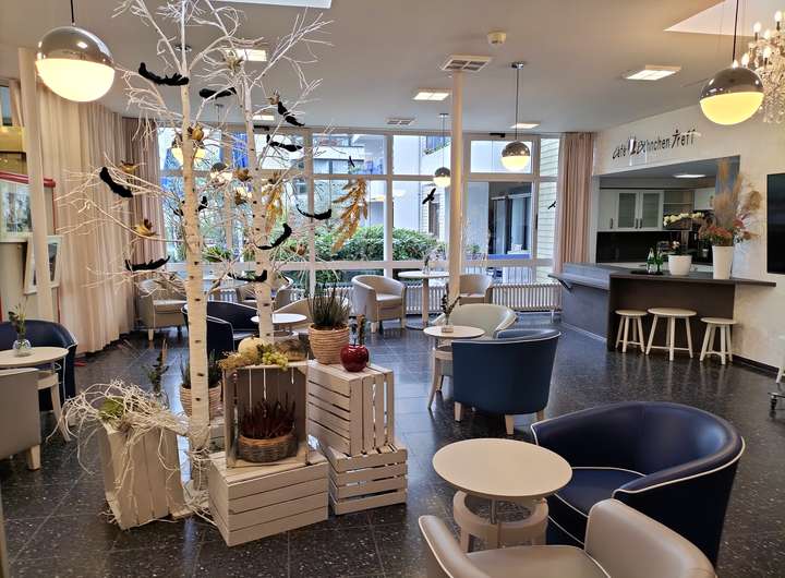 Die Cafeteria des Seniorenheims ist für Gäste geöffnet und bekannt für Kaffeespezialitäten. Das Haus bietet auch Mittagessen für Mieter an (Komfortpaket/Zehnerkarten).