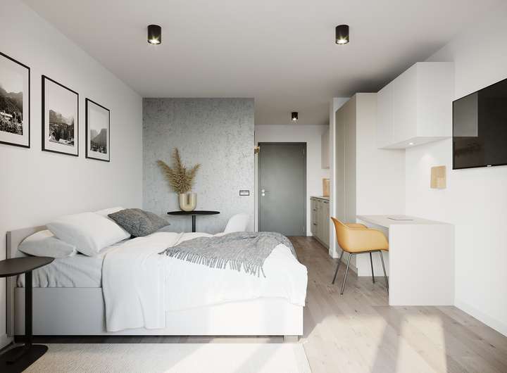 So werden die zwischen 19 und 39 m² großen Apartments mit Gefühl für die Bedürfnisse der Zielgruppe optimal in Szene gesetzt. Passend dazu ist das jeweilige Farb- und Lichtkonzept abgestimmt – modern und zeitlos elegant. Mit viel Liebe zum Detail und hochwertiger Möblierung überzeugen die Lifestyle-Apartments auf ganzer Linie. Einfach einziehen und los leben! Schöner kann studentisches Leben kaum sein.
