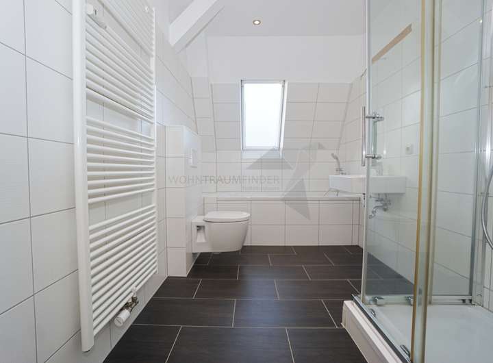 + hochwertig gefliestes Bad mit Badewanne, Dusche, Handtuchheizkörper und Waschmaschinen-Stellplatz