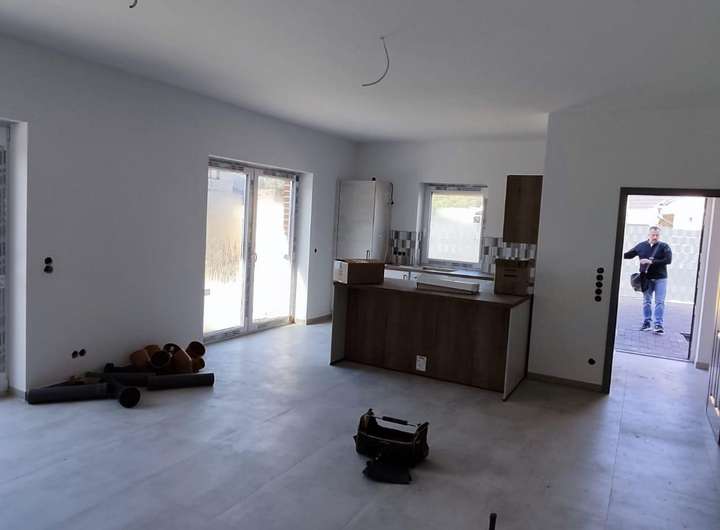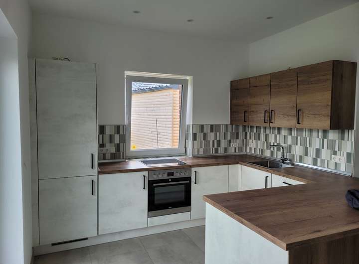 Wunderschöne Doppelhaushälfte mit offenem Grundriss und individueller Ausstattung. Offener Wohnraum mit Küche ( Einbauküche mit Geschirrspüler und Frühstückstheke ) und Doppelflügeltüren zur großen Terrasse (21m2).