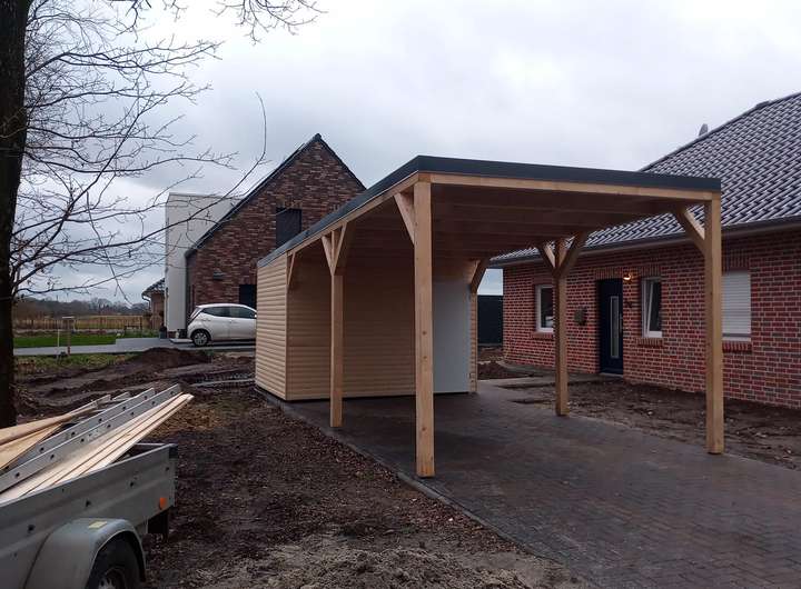 Im Außenbereich finden Sie eine gepflasterte Einfahrt mit Carport und Schuppen, der über Licht und Strom verfügt.