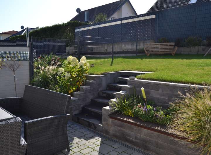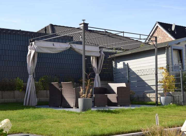 Es sind 2 Terrassen vorhanden. Eine ist direkt aus dem Wohnzimmer begehbar und die zweite befindet sich auf der Rasenfläche. Der Garten kann von außen über ein Gartentor rechts von der Garage betreten werden.