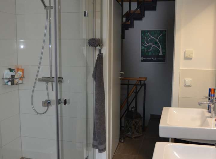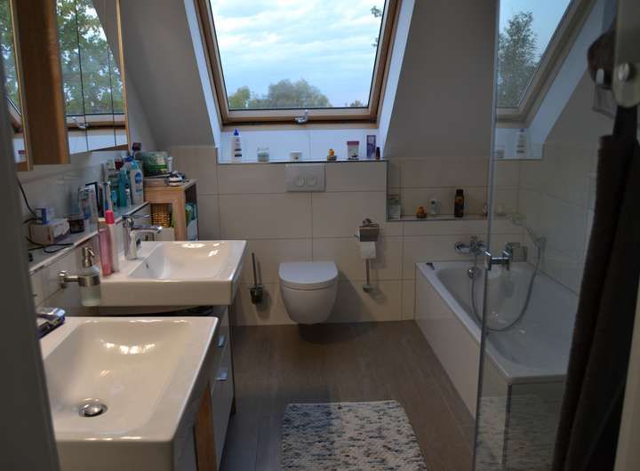 Das große Schlafzimmer und das dazugehörige Ankleidezimmer sind mit Parkett ausgelegt. In den beiden kleineren Zimmern liegt Laminat. Badezimmer und Flur sind im gleichen Feinsteinzeug gehalten wie das EG. Das Bad verfügt über eine Badewanne, eine ebenerdige Dusche aus Sicherheitsglas und 2 separaten Waschbecken.
