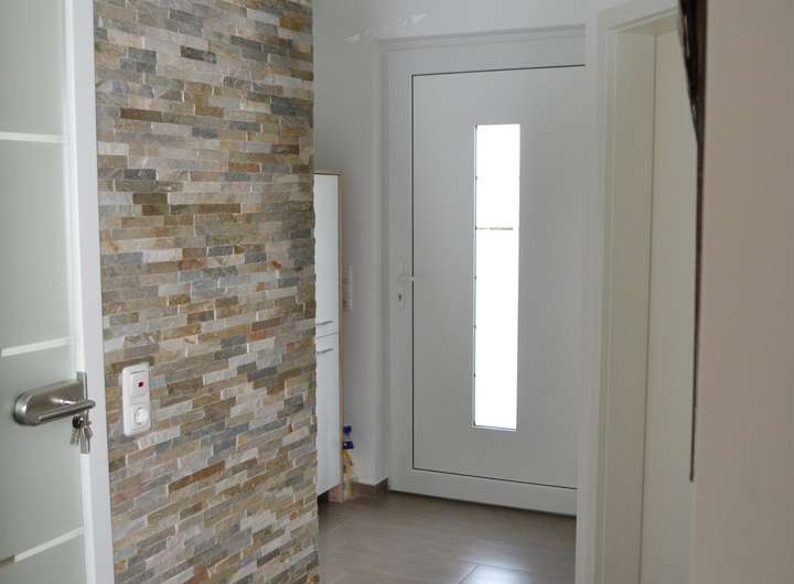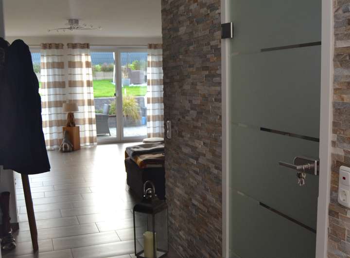 Die Bodenbeläge im EG sind aus Feinsteinzeug. Durchgängig liegt Fußbodenheizung. Jedes Zimmer im EG und OG verfügt über elektrische Rollläden. Im EG befindet sich ein Gäste WC sowie ein Hauswirtschaftsraum mit Abstellmöglichkeit und einem Waschmaschinenanschluss.