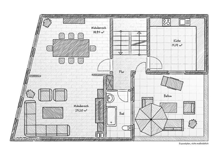 Der Durchgang zur Wohnung über das Treppenhaus liegt neben dem Ladenlokal. Im ersten Obergeschoss befindet sich ein offener Ess- und Wohnbereich, eine geräumige Küche und ein Badezimmer mit Badewanne. Vom Flurbereich gelangen Sie auf die kleine Dachterrasse.
