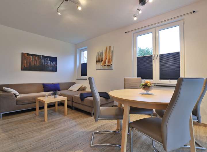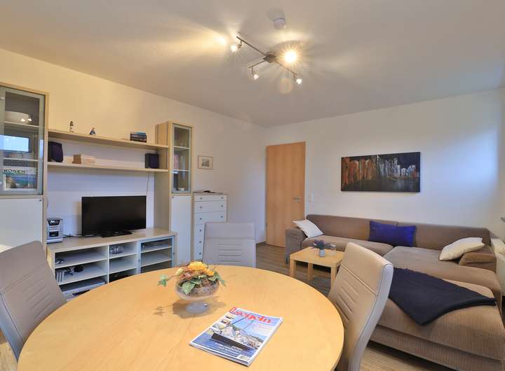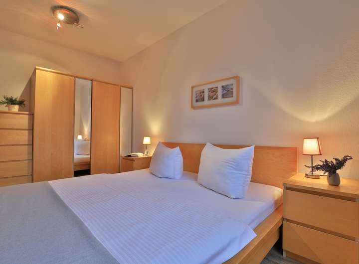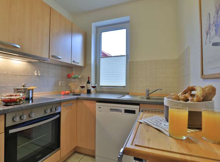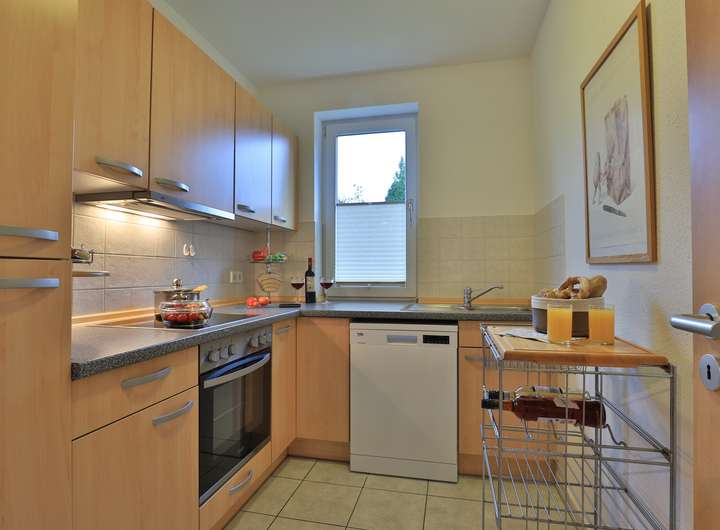 Die Grundrissaufteilung ist gut durchdacht und für die Nutzung mit bis zu 4 Personen sehr praktikabel. Das Wohnzimmer bietet mit seiner Sitzecke die besten Voraussetzungen für einen gemütlichen Aufenthalt. Zur weiteren technischen Ausstattung gehören ein Fernseher, ein Videorecorder, ein DVD- Player und eine Hifi- Anlage. Die Wohnung ist kinder- und familienfreundlich eingerichtet. Im Schlafzimmer befinden sich ein Doppelbett und ein geräumiger Kleiderschrank für Ihre Garderobe sowie ein zweiter Fernseher. Die separat angeordnete Küche ist mit einer Einbauküche (Kühlschrank, separater Gefrierschrank, Herd, Backofen, Geschirrspüler, Mikrowelle) ausgestattet. Im Tageslichtduschbad befinden sich auch eine Waschmaschine und ein Trockner.