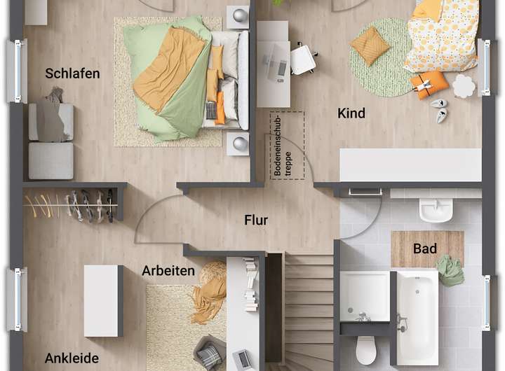 Auch das Obergeschoss zeigt sich im klaren Baustil des Flair 124. Hier befinden sich drei Räume, die Sie als Schlaf-, Kinder-, Gäste- oder Arbeitszimmer nutzen können. Dank großer Fenster wirken alle Zimmer hell und freundlich.