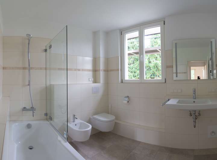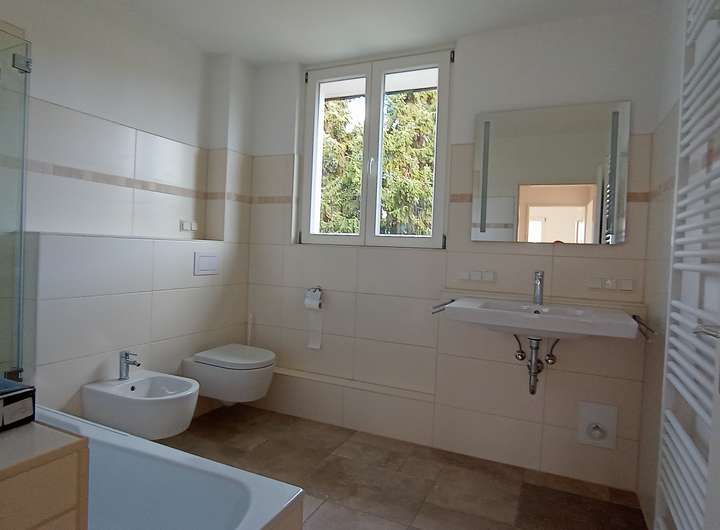 und ausgestattet. Ein Bad hat ein Bidet. Eine Fußbodenheizung schafft ein angenehmes Wohnklima. Das Eichenparkett im Wohnzimmer ist abgeschliffen und geölt.