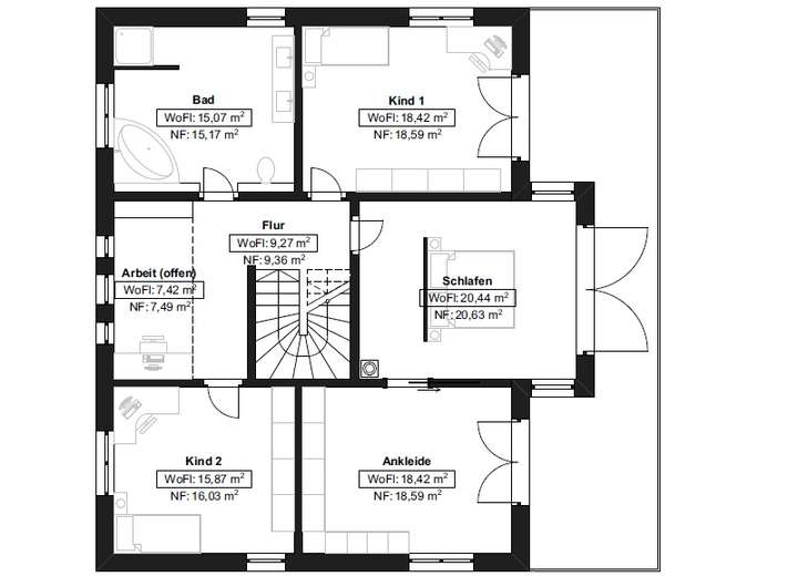 Raum u.a. dem Wohn- und Essbereich des Erdgeschosses. Im Dachgeschoss