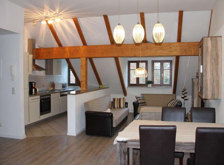 In der gemütlichen Maisonette-DG-WE mit tlw. Sichtdachstuhl und Blick auf die Peterskirche befindet eine EBK und ein separater Dachabstellraum.
