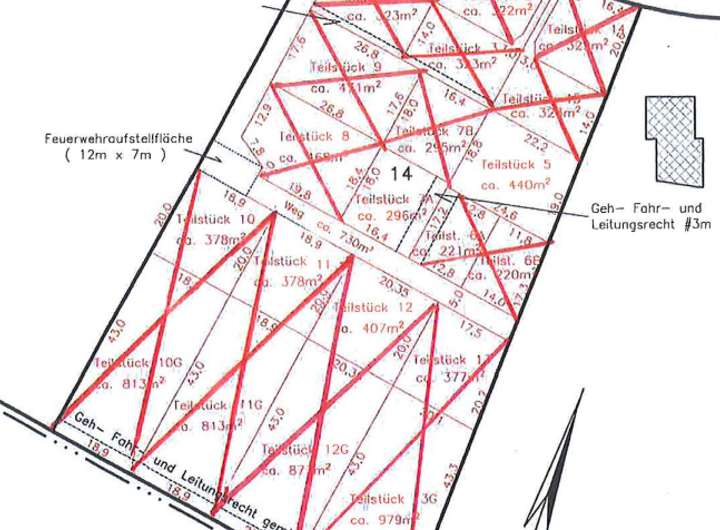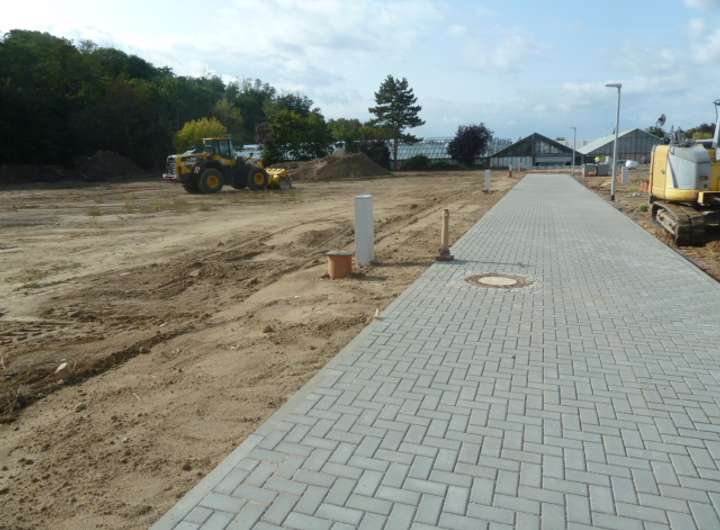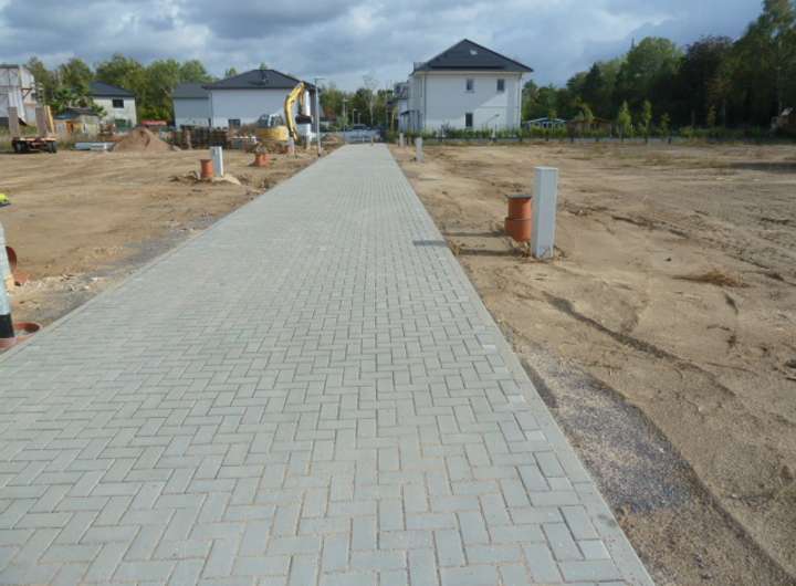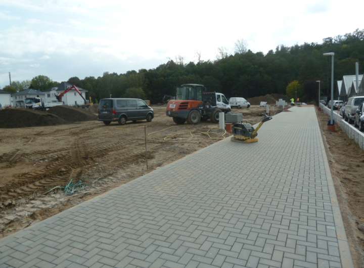 Durch die Erschließungsstraße (Gemeinschaftsfläche) sind die neuen Baugrundstücke komplett erschlossen, das heißt sämtliche notwendigen Versorgungsleitungen wurden bis 1 m hinter die jeweilige Grundstücksgrenze verlegt. Die Straßenbeleuchtung erfolgte vorschriftsmäßig ebenso wie die endgültige Befestigung der Straße durch Dränpflaster.