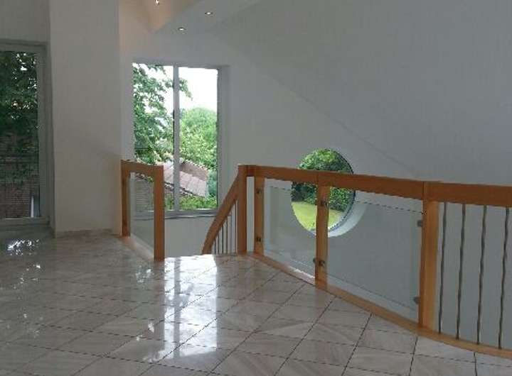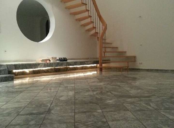 Fußbodenheizung, Granitbad, Marmorböden, Glastüren, helle offene Bauweise. Gästebad in EG. Wohnzimmer / Galerie mit offenem Giebel, große helle Küche mit großem Essbereich (bis zu 10 Personen finden bequem Platz), raumhohe wärmeisolierende Fenster und Terrassentüren.