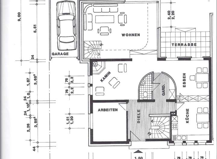 Garage: mit Überlänge, Platz für ein Auto, Motor- und Fahrräder, Waschbecken, Wechsel- und Gleichstrom, zwei Garagentore um leicht und bequem in den Garten zu gelangen.