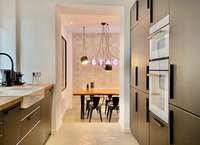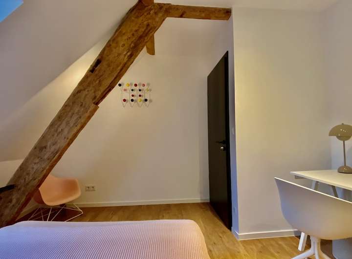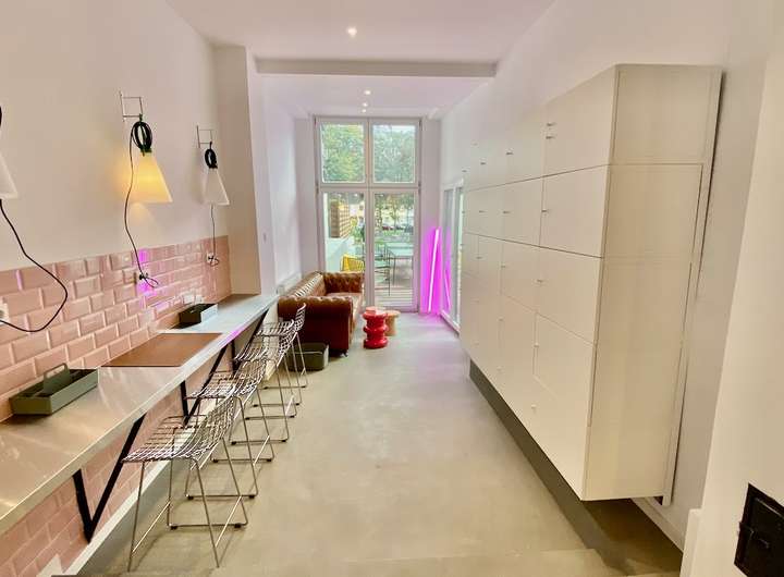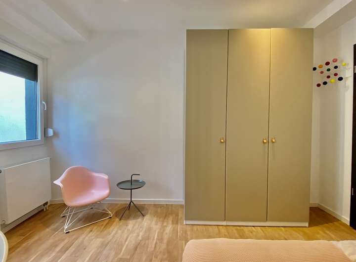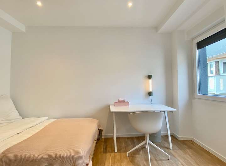 Double-bed, wardrobe, desk and chair, art and an armchair, all in your room. You get weekly flat cleanings, washer-dryer in the apartment (iron and ironing board too), plus utilities like media, electricity, heating and Wi-Fi. Sounds like everything? It’s not: We also provide all the little household essentials, like tableware and kitchen equipment, from bottle opener to the espresso spoon. Mostly we provide a common lounge area or dining zone where you can hang out with your friends and flat-mates.