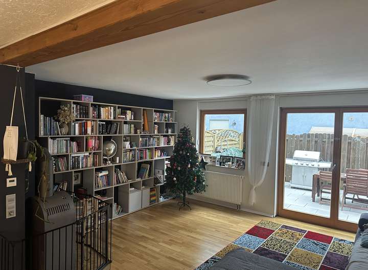 Im Erdgeschoss des Hauses befinden sich ein Gäste-WC und das Wohnzimmer mit einem Schwedenofen und zwei Terassentüren über die man in den Garten gelangt. Im zweiten Geschoss des Hauses befinden sich 3 Schlafzimmer und das Tageslichtbad mit Dusche, und Toilette.