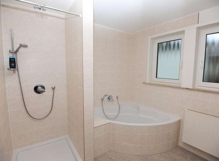 Über den Flur gelangt man über den offenen Essbereich zur charmanten Küche mit Einbauküche, sowie in das Tageslichtbad mit Badewanne und Dusche. Auch ein separates WC mit Fenster ist ebenfalls vorhanden.