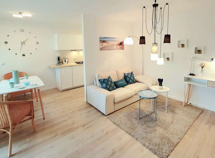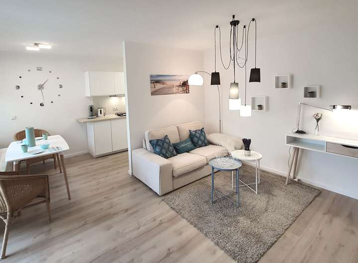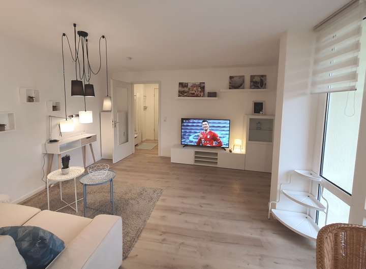 - Wohnzimmer mit TV 55", Couch und Tisch,