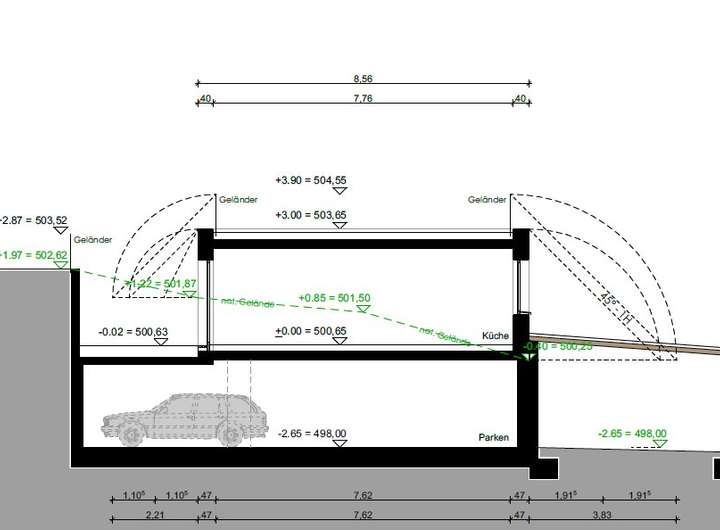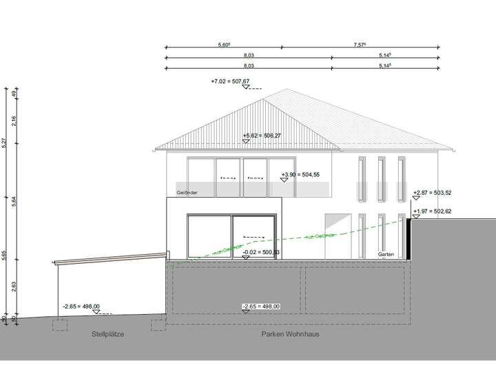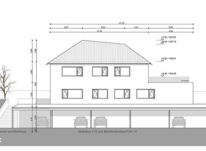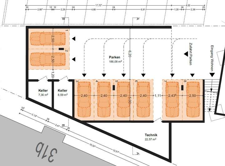 Unter dem Haus befindet sich die Garage mit Kellerabteilen, dem Technikraum und 8 Kfz-Stellplätzen.