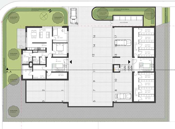 Es wurden insgesamt 9 Wohnungen, jeweils zwischen 88 und 94 qm groß, 3- Zimmer-Küche-Bad, Gäste-WC, Abstellraum und großen Wohn-und Esszimmer mit Terrasse bzw. Balkon geplant und genehmigt.