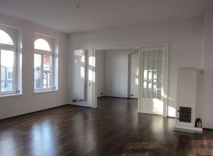 Sanierte Altbauwohnung mit besonderem Flair - perfekt geeignet für 1-2 Personen; dauerhaft oder als 2.-Wohnsitz – über 30 m² Wohnzimmer mit Kachelofen sowie eleganten Glasflügeltüren – XL-Tageslichtbad mit sehr großer Dusche und Waschmaschinenplatz – geräumige Wohnküche (ohne EBK, optional gegen Abstandzahlung von Vormietern zu erwerben) – Wintergarten – Index-Mietvertrag