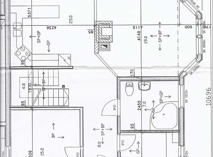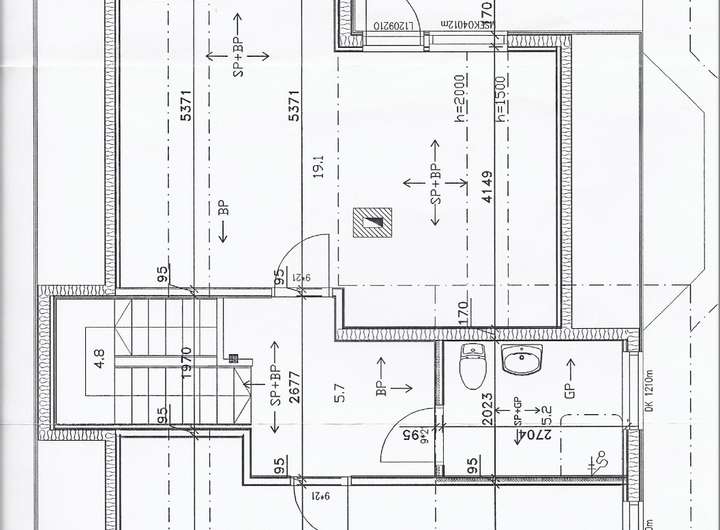 Im hinteren Bereich befindet sich das Bad (mit Außenfenster) mit gefliester, ebenerdiger Dusche und Badewanne. Ein großzügiger Hauswitschaftsraum mit zusätzlichem Gäste WC befindet sich neben dem Windfang des Hintereingangs gegenüber einem weiteren Schlafzimmer.
