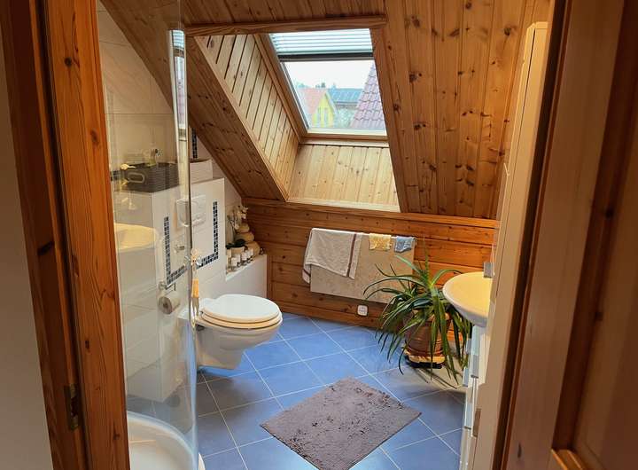 Zum Obergeschoß gelangt man über eine großzügige Holztreppe. Hier befinden sich 2 weitere, große Schlafzimmer, die durch ein gemeinsames Bad (mit Dusche und Dachfenster) und dem Flur getrennt sind. Das vordere Schlafzimmer verfügt über einen überdachten Balkon.