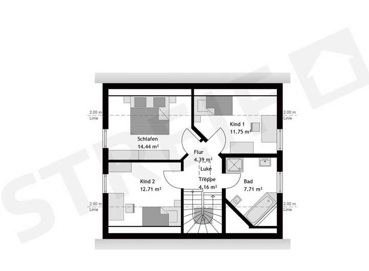 Im Dachgeschoss des Hauses sind zwei schöne Kinderzimmer, ein Elternschlafzimmer, ein Flur und ein Familienbad untergebracht. Die Netto-Raumfläche beträgt 117,65 m².