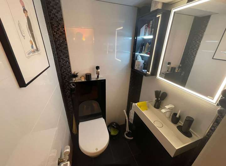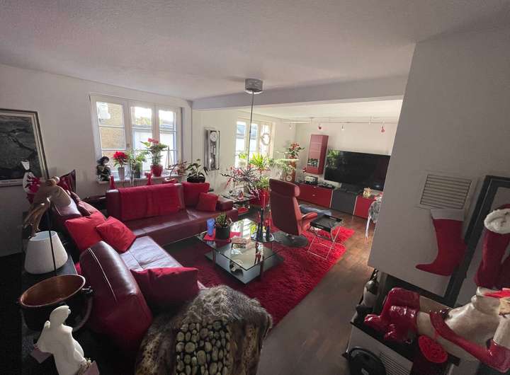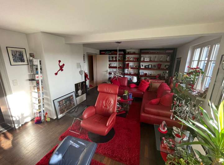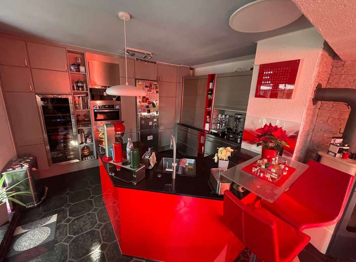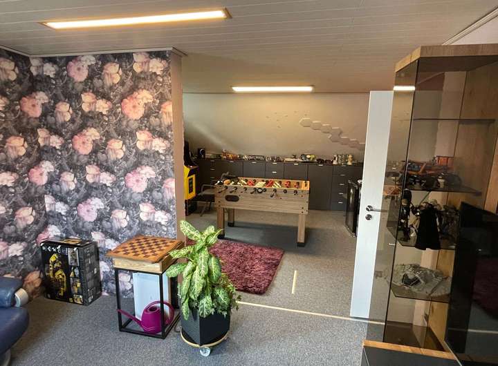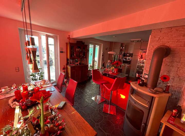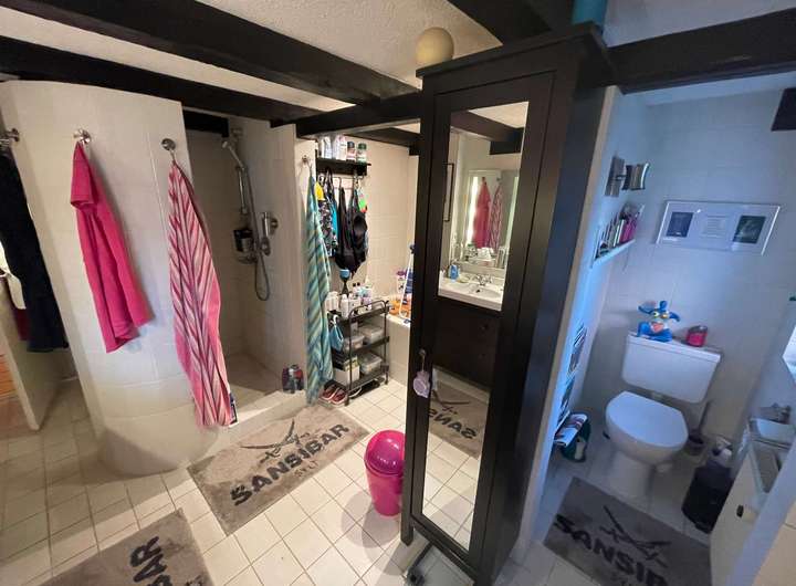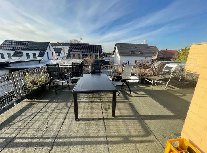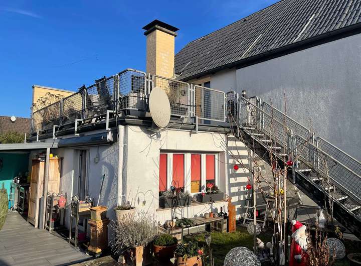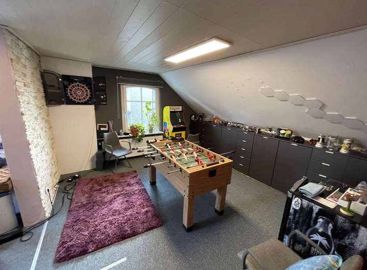 In der Mitte der Diele führt ein Treppenaufgang in die großzügig dimensionierte Einliegerwohnung über zwei Ebenen im Ober- bzw. Dachgeschoss des Hauses. Im Mittelpunkt steht das lichtdurchflutete Wohnzimmer mit einem weiteren Kaminofen sowie einem Zugang auf eine herrliche Dachterrasse oberhalb des eingeschossigen Anbaus. Eine geräumige Küche sowie ein Gäste-WC komplettieren dieses Geschoss, bevor ein weiterer Treppenaufgang hinauf in die obere Wohnebene führt. Dort befinden sich ein miteinander verbundener Wohn- und Kickerraum, ein Arbeitszimmer mit sich anschließendem Schlafraum sowie ein Tageslichtbad mit weißen Sanitärobjekten und einer Badewanne. Die in sich abgeschlossene Einliegerwohnung ist alternativ zur Diele ebenso von der Hofseite über eine Außentreppe zur Dachterrasse erreichbar.