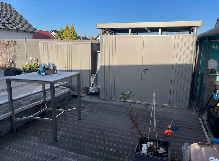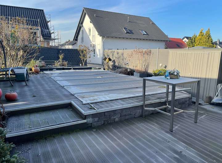 Der Außenbereich der Immobilie erschließt sich seitlich des Gebäudes bis zur Hofseite mit einer überdachten Terrasse sowie einer großflächigen Poolanlage bis zum hinteren Teil des Grundstücks. Umgeben wird der Pool von zwei Seiten durch eine Terrasse in Holzoptik in bevorzugter Sonnenlage und einem Gartenhaus aus wetterfestem Metall. Abschließend zu erwähnen ist der große Carport mit einem angrenzenden Abstellraum, der bis zu fünf Personenkraftwagen oder sogar einem Wohnmobil die Möglichkeit zum Unterstellen bietet.