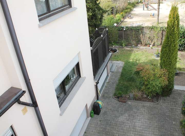 Die Wohnung in der 1. Etage bietet ebenfalls 2 Schlafzimmer, ein Tageslichtbad mit Wanne und Dusche, Wohn- und Essbereich, Küche mit Zugang zum Balkon.