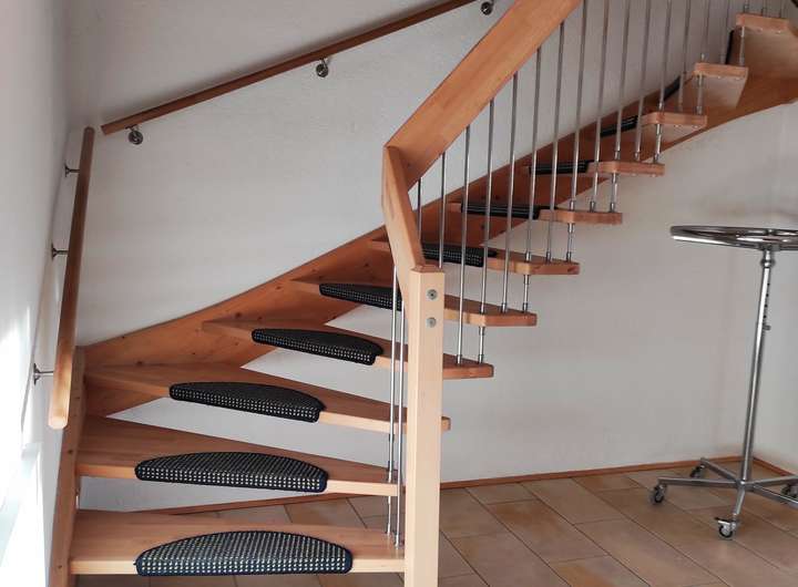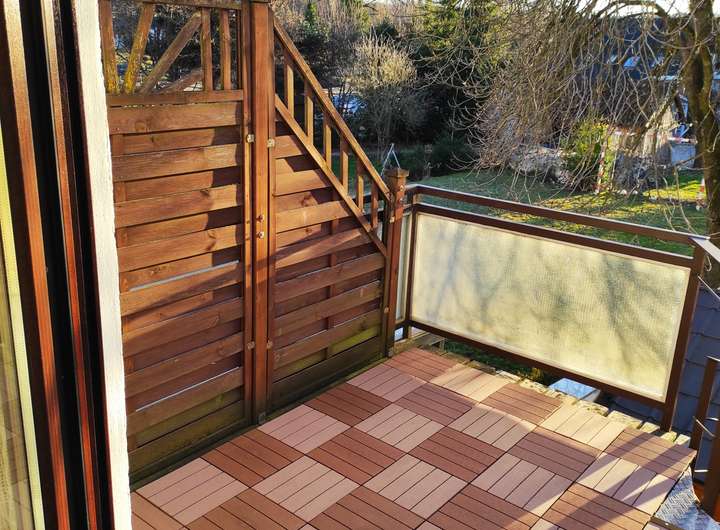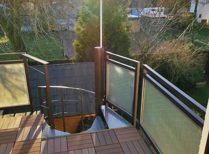 Die Wohnung hat zwei Terrassen. Eine im Obergeschoß (Frühstücksterrasse ) die über die Küche zugänglich ist und einer zweiten im Erdgeschoß. Über eine Wendeltreppe erreichen sie die Hauptterrasse mit einem kleinen aber feinen Garten. Hier kann man ein Pavillon mit Tische und Stühle zum Grillen aufstellen.