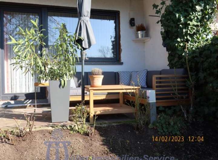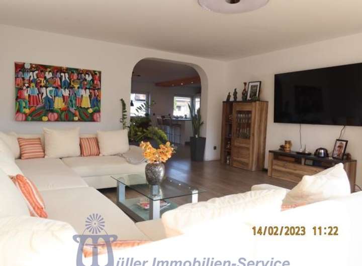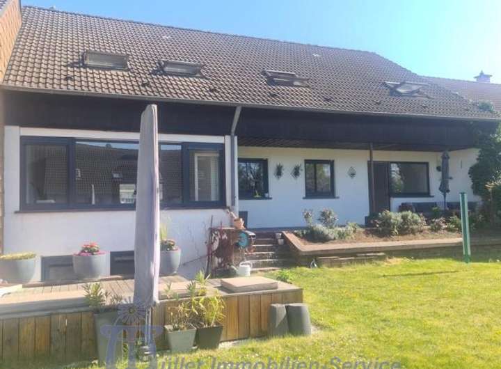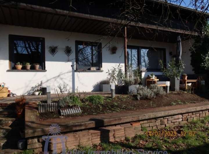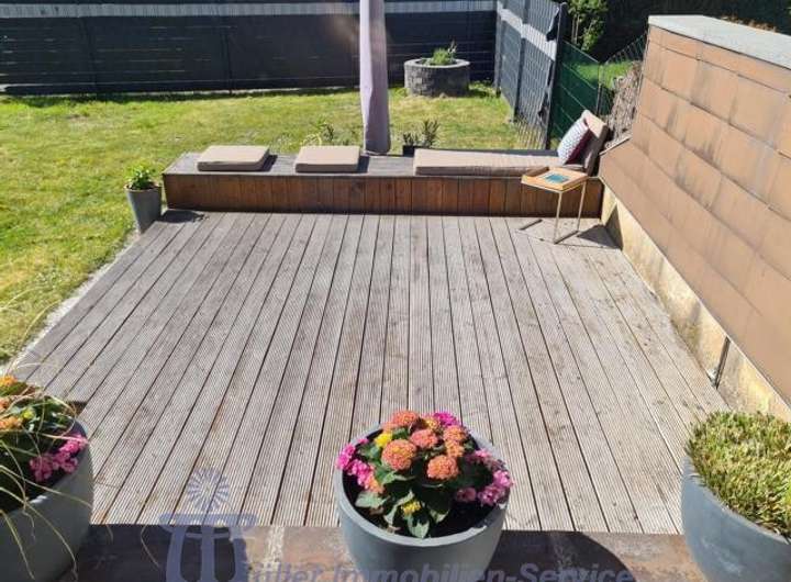 Vom lichtdurchfluteten Wohn-Esszimmer mit großer durchgängiger Fensterfront gelangt man auf eine ca. 20 m² große überdachte SW-Terrasse, auf eine ca. 20 m² große in Bangkirai-Holz angelegte Freiterrasse sowie in den komplett eingefriedeten Garten, der pflegeleicht als Rasenfläche mit Ziersträuchern angelegt ist.