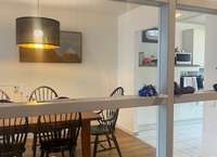 Man betritt das Haus und befindet sich in einer geräumigen Diele. Die Küche bietet reichlich Platz zum gemütlichen Verweilen. Der halboffene Essbereich weitet sich zum gemütlichen Wohnbereich aus, von dem man an mehreren Möglichkeiten zum Austritt in den Garten hat.