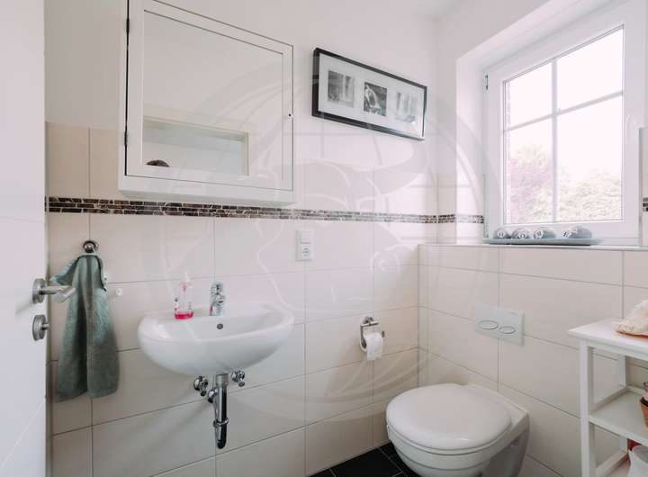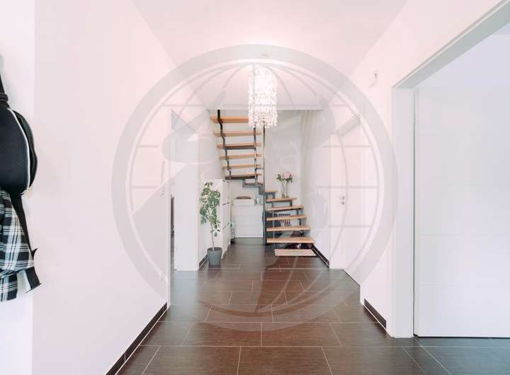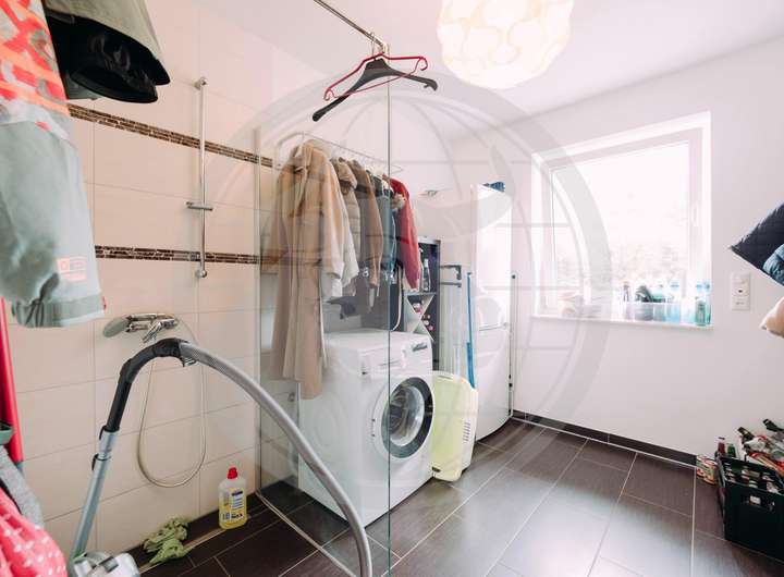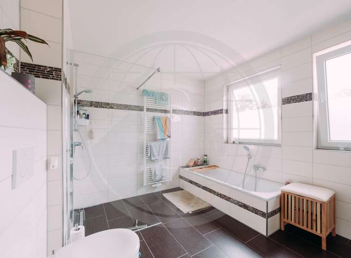 Die Ausstattung des Hauses überzeugt durch hochwertige Materialien und eine gepflegte Optik. Moderne Fliesen, stilvolle Holzböden sowie komfortabler Teppich sorgen für ein harmonisches Wohnambiente. Insgesamt stehen drei Bäder zur Verfügung – eines mit Badewanne und Dusche, zudem befindet sich eine weitere Dusche im Hauswirtschaftsraum.