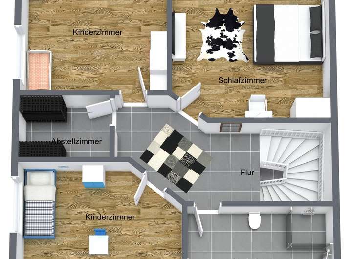 Im Obergeschoss erwarten Sie drei gut geschnittene Zimmer: ein behagliches Schlafzimmer sowie zwei weitere Räume, die sich flexibel als Kinderzimmer, Gästezimmer oder Büro nutzen lassen. Das moderne Tageslichtbad dieser Etage überzeugt mit einer einladenden Badewanne und einer komfortablen, ebenerdigen Dusche – ein perfekter Rückzugsort für kleine Wellnessmomente. Ein zusätzlicher Abstellraum sorgt für Ordnung und praktische Staufläche.