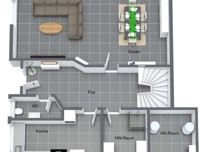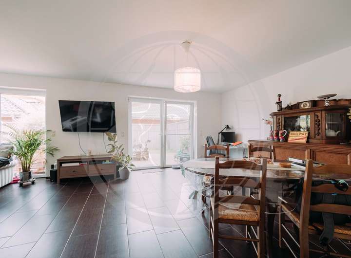 Das Herzstück des Hauses bildet jedoch der offene Wohn- und Essbereich. Mit seiner großzügigen Fensterfront flutet er den Raum mit Licht und schafft eine warme, lebendige Atmosphäre. Von hier aus gelangen Sie direkt auf die sonnige, nach Süden ausgerichtete Terrasse – ein Ort zum Verweilen und Genießen, ideal für entspannte Stunden im Freien oder gesellige Grillabende mit Freunden.